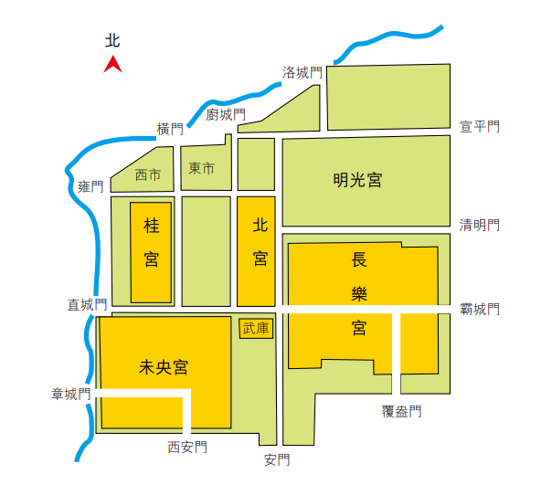 我們再來看一下唐代長安城平面示意圖。下圖中北面正中區域就是所謂「宮城」,是皇帝居住的地方。它的南面就是所謂「皇城」,即政府機構所在地。除了西市、東市兩個市場,剩下的棋盤狀的一個個格子就是老百姓住的地方。隋文帝時期修建的長安城的東北角並沒有凸出來的一塊,這是唐代貞觀八年(634)以後增建的。唐高宗和武則天時期,把它擴建為大明宮。所以,以後大家看到古長安城地圖,如果無法判斷到底是隋代的長安城還是唐代的長安城,一定要看一下東北角有沒有凸出來這一塊,這是一個主要的區別。