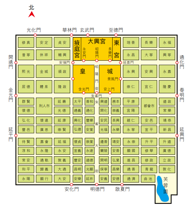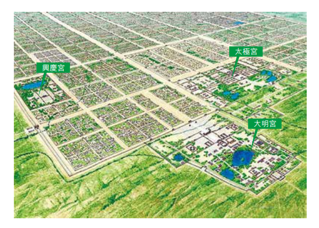 隋代長安城是一個比較規整的長方形,沿中軸線嚴格地左右對稱,呈棋盤狀的佈局,東西長9721米,南北寬8651.7米,周長約是36千米,總面積是84.1平方千米,這都是現代考古數據。我們今天看到的西安古城牆為明代所建,隋唐長安城比明代的西安城要大六倍。皇帝所居住的宮城,位於整個城市的最北端。宮城以南是皇城,皇城是政府機構集中的地方。整個外郭城有9座城門、14條東西大街、11條南北大街,而且有110個坊,當然坊的數字隨著時代的不同前後有變化。另外還有都會市(唐代稱東市)和利人市(唐代稱西市)兩個大型的市場。