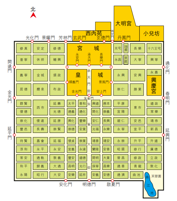上圖是日本的繪圖專家黑澤達矢繪製的長安城復原圖。他的圖方向是由北向南,大家注意,眼睛是由下北上南這個方向看過去的。他繪製的一定是盛唐時期。因為興慶宮是唐玄宗建的,在唐玄宗以後,長安城才是這個樣子。