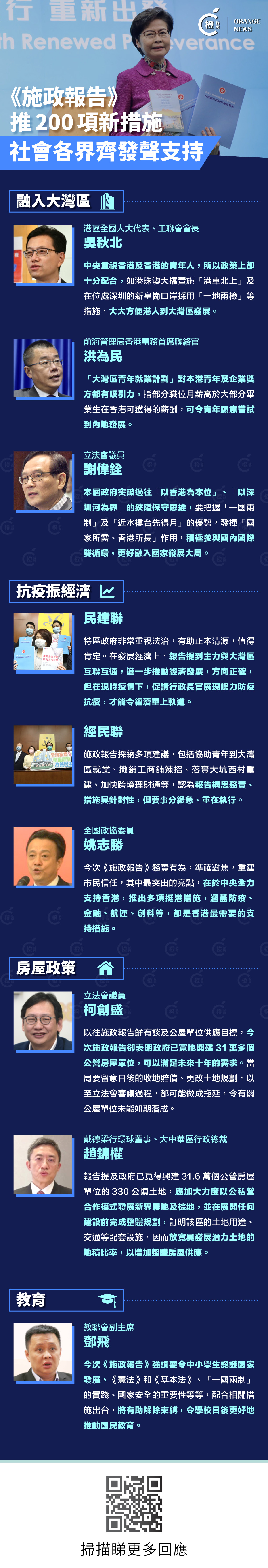 【橙訊】行政長官林鄭月娥今日(25日)赴立法會發表《2020年施政報告》,《橙新聞》採訪並整理出社會各界對於200項新措施的回應和建議,與讀者分享。