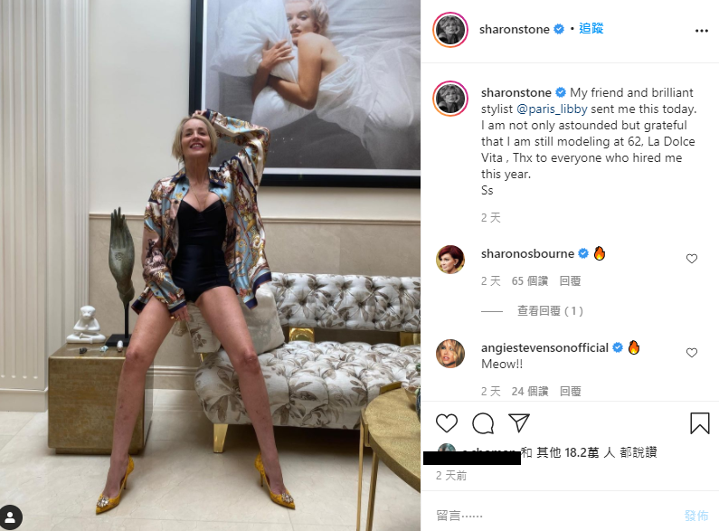 莎朗史東身穿黑色穿低胸高叉裝,勁晒長腿,留言講到:「我不單吃驚,也感到感恩我已經62歲仍在做模特兒。」舉手投足都滿足自信,果然是不老女神。