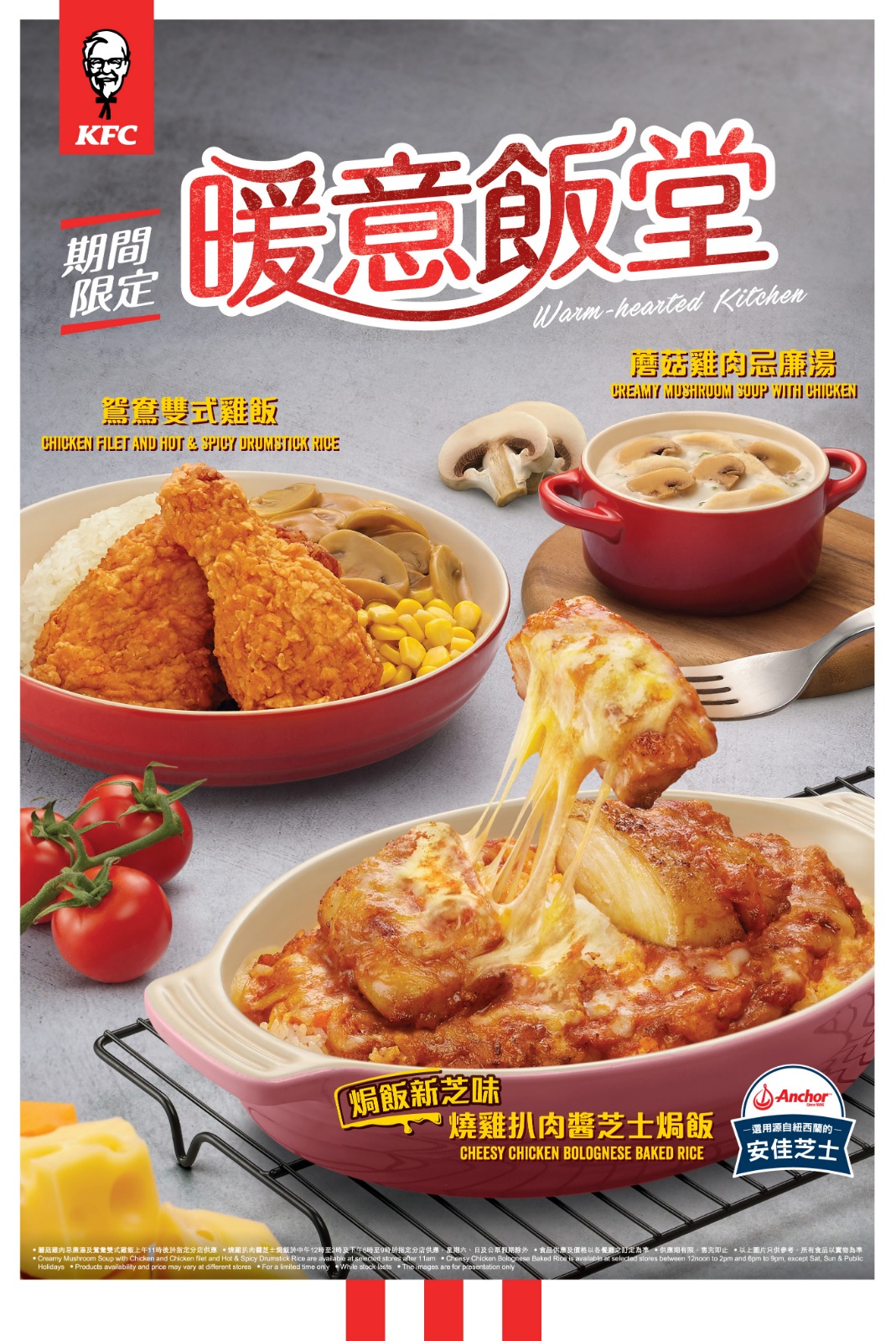 【橙訊】一旦天氣開始轉涼,就會特別想品嚐熱辣辣的美食,KFC為你準備了最窩心的全新選擇,於12月3日起推出期間限定「燒雞扒肉醬芝士焗飯」,同時推出「鴛鴦雙式雞飯」及指定分店限定的「俄式脆雞飯」。更有溫暖入心的「蘑菇雞肉忌廉湯」,將雞肉滋味昇華。