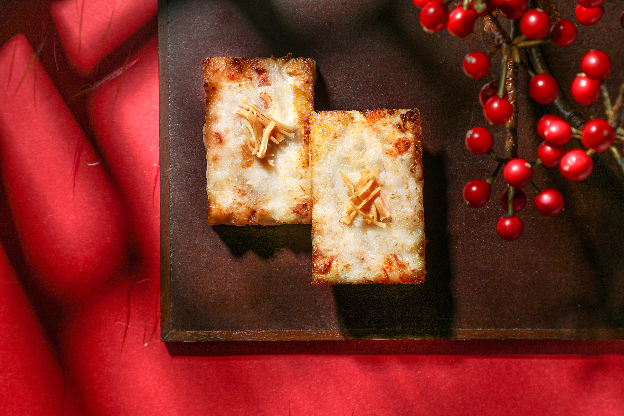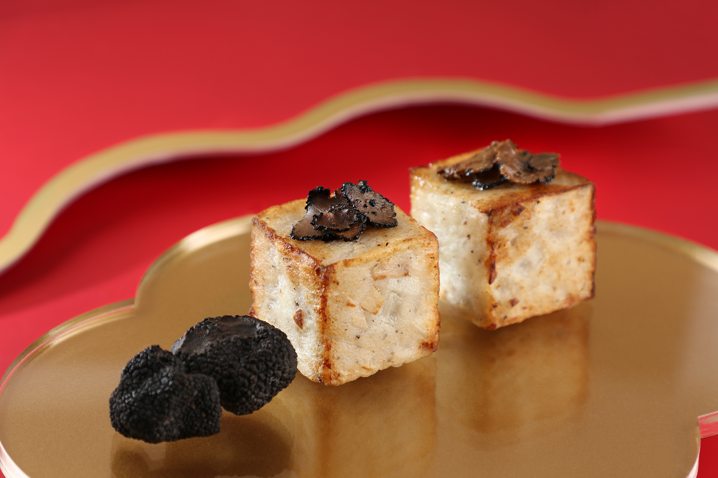 除了皇牌糕品「巴馬金腿蘿蔔糕」及「沖繩黑糖椰汁年糕」外,國金軒今年匠心設計的兩款貴氣新品年糕令人十分期待。「黑松露純素蘿蔔糕」以意大利黑松露牛肝菌醬、香菇粒及雞髀菇粒混合製成,更特別加入鮮淮山片增加口感。特別適合素食者或追求健康的人士享用。