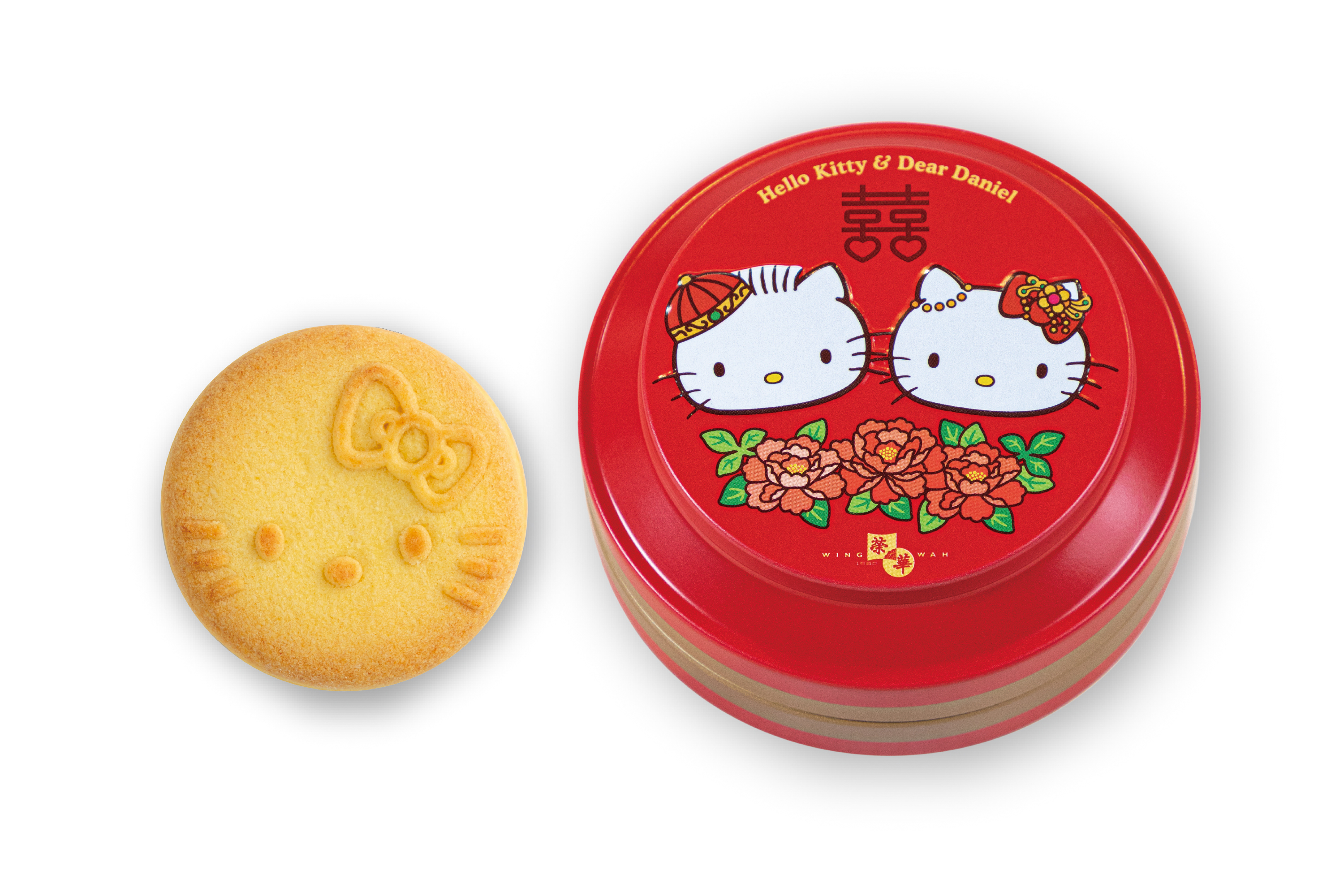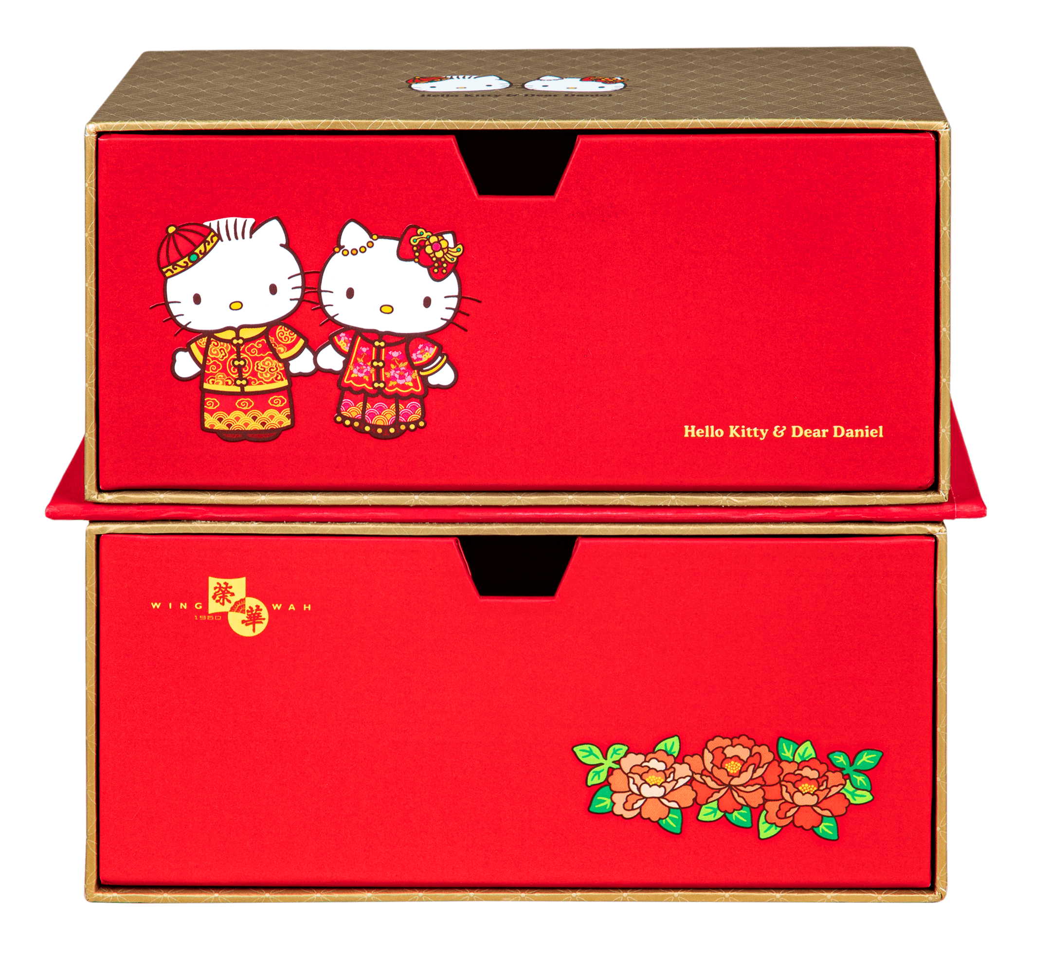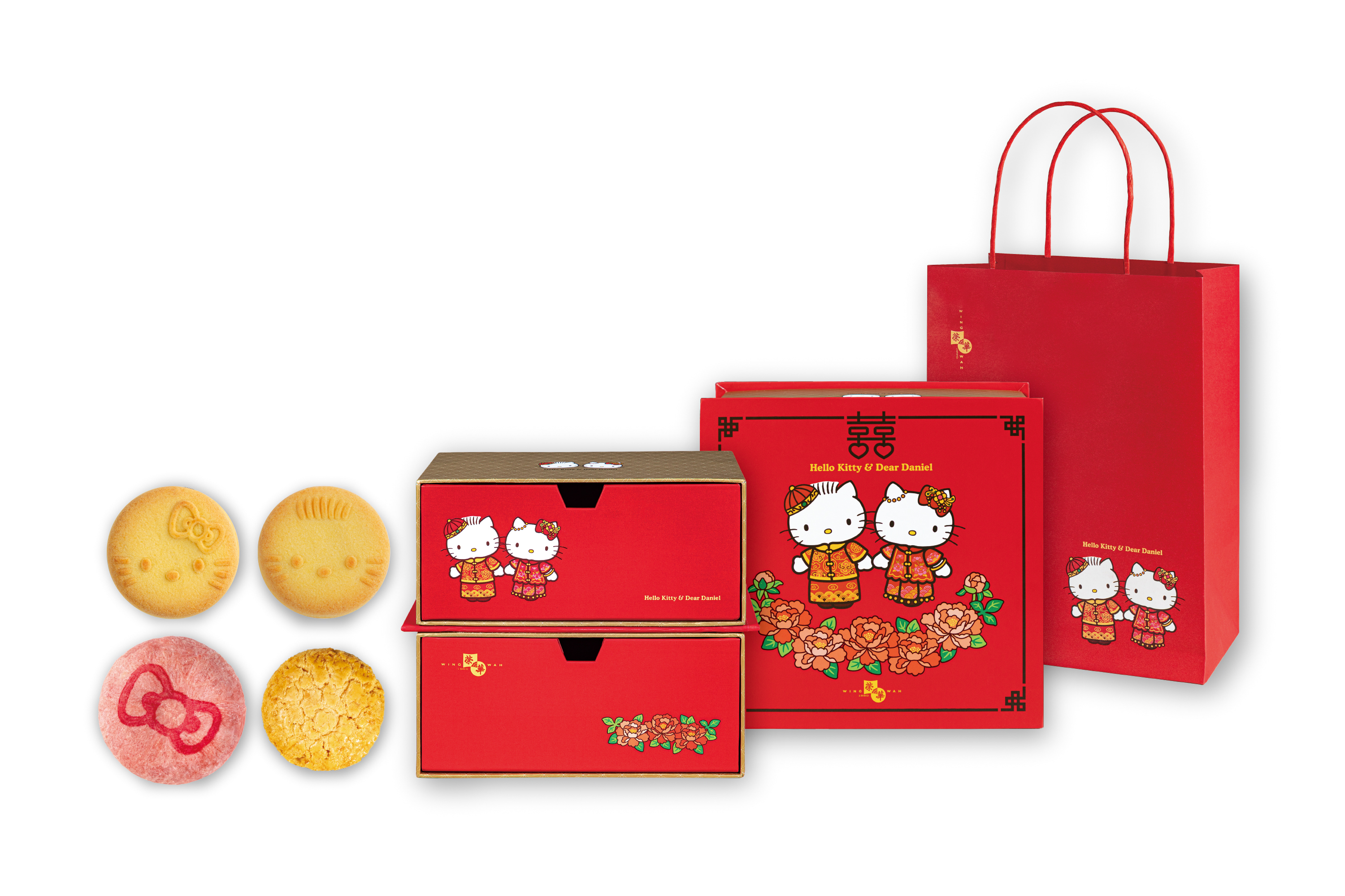 迷你紅綾蓮蓉酥印有標誌性的Hello Kitty蝴蝶結圖案;鳳梨酥則分別印有Hello Kitty及Dear Daniel的造型,收藏囍餅的禮盒更可當作變形抽屜,玩味十足又夠實用。