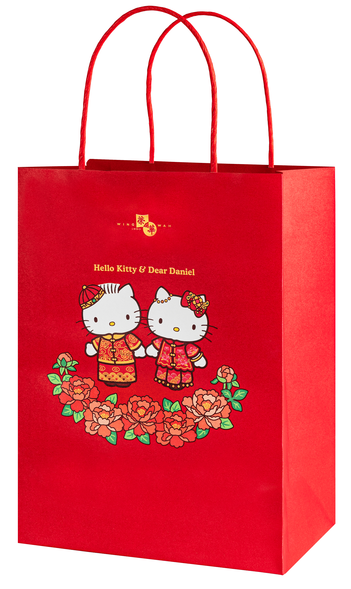 隨囍餅禮盒附送的禮袋設計精美,為傳統的嫁囍禮餅帶來不一樣的年輕時尚感。禮盒套裝另外備有專用囍餅禮券,憑券可換領Hello Kitty &Dear Daniel 甜蜜蜜囍餅禮盒乙盒。