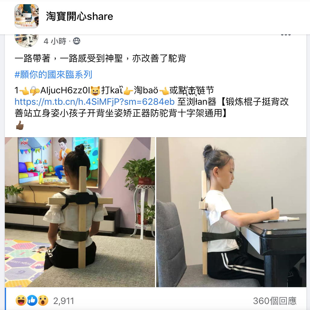 十字架坐姿矯正器的售價為20至40元人民幣,有用家評語:「沒有異味,做工精細,沒有毛刺。貨真價實的木質,希望可以有效糾正不良行為,提升小朋友的形象氣質。」其實坊間矯正肩膀的工具繁多,不一定要十字架形吧。