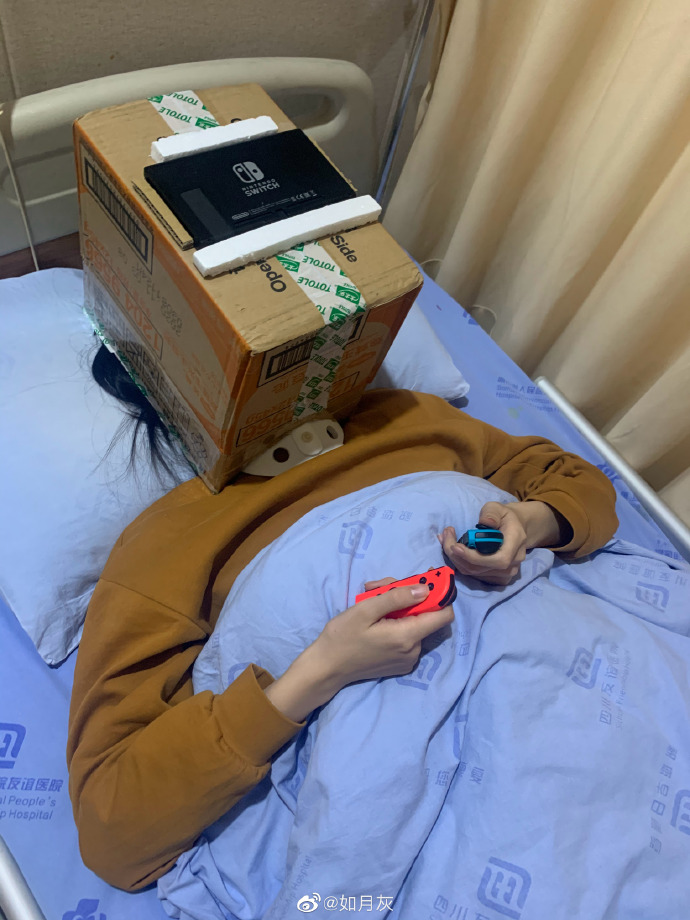 內地一名動漫博主「如月灰」近日出了車禍,需要戴上頸托固定,並留院兩至三周。住院期間,她想玩任天堂遊戲機Switch,於是用紙皮箱DIY了一個罩著頭部的密閉空間,拉遠Switch主機的距離,好讓她即使躺在病床上都能好好打機。