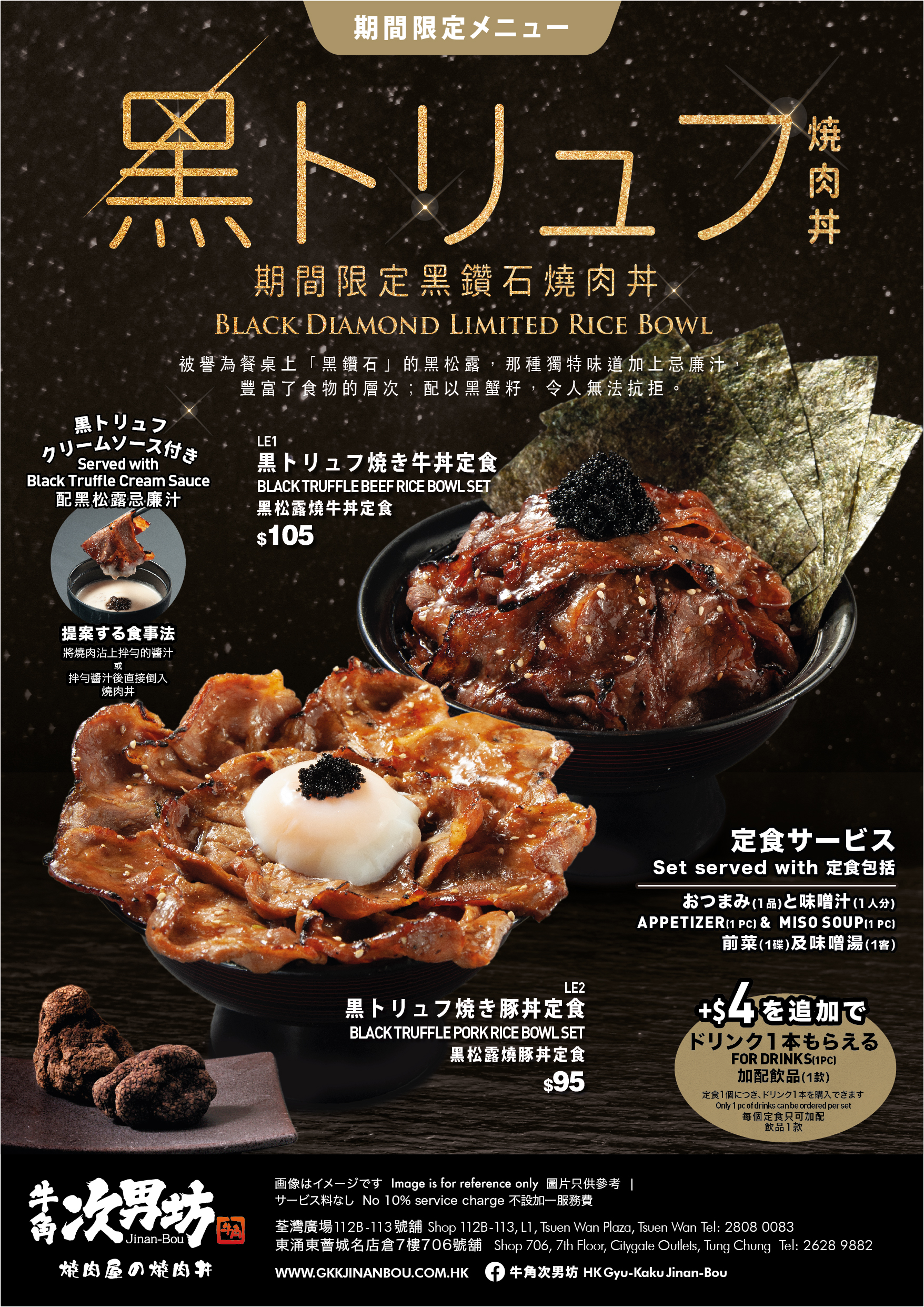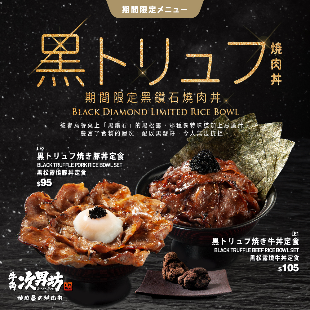 全新推出的「黑松露燒牛丼定食」($105)及「黑松露燒豚丼定食」($95),均以黑飛魚籽作襯托,配搭濃郁非常的黑松露忌廉汁,滋味十足。