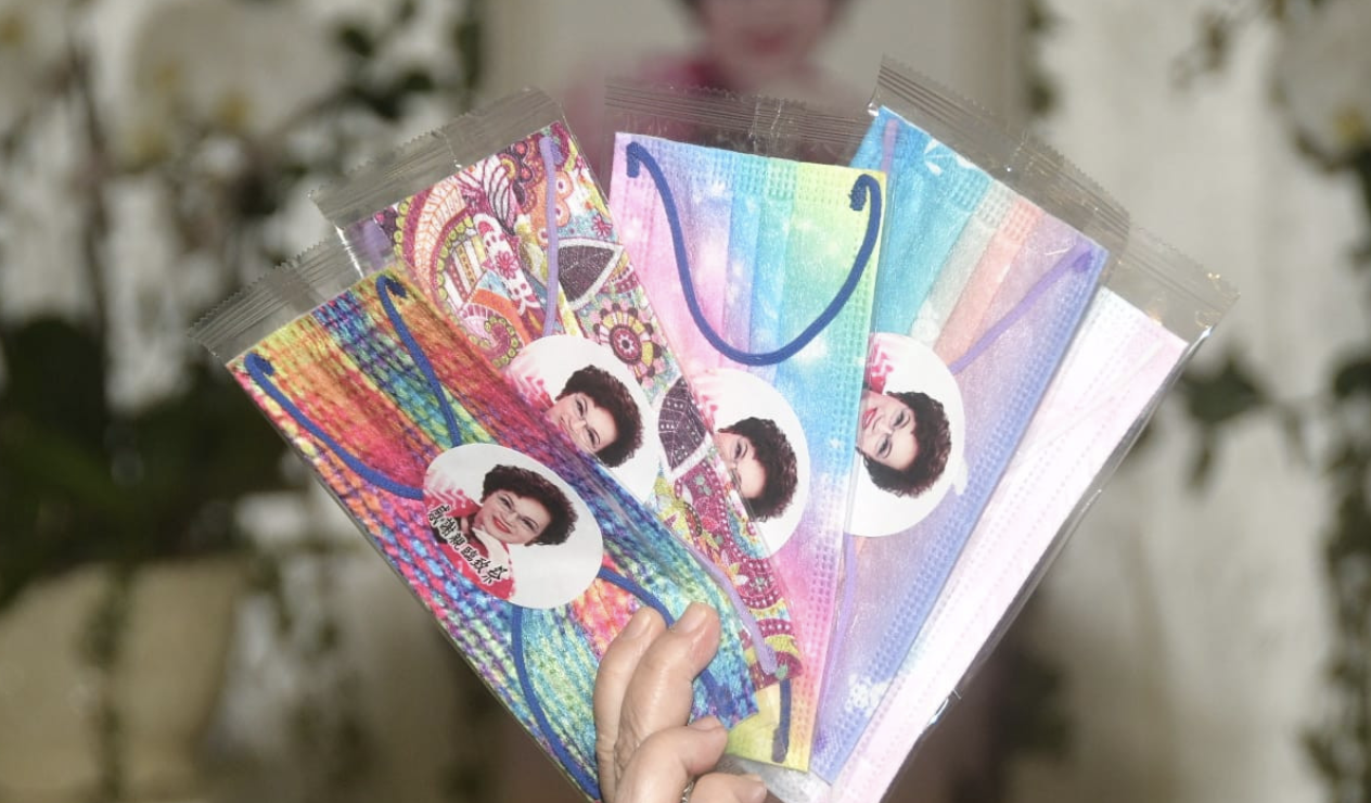 另外,來賓簽到的位置備有消毒搓手液,亦有擺放印有琴姐肖像的彩色口罩。琴姐契仔陸永昌 (Ring)表示彩色口罩是寓意契媽人生充滿色彩,希望每位送別契媽最後一程的朋友都有一個口罩,也祝福大家的人生像契媽一樣充滿色彩。