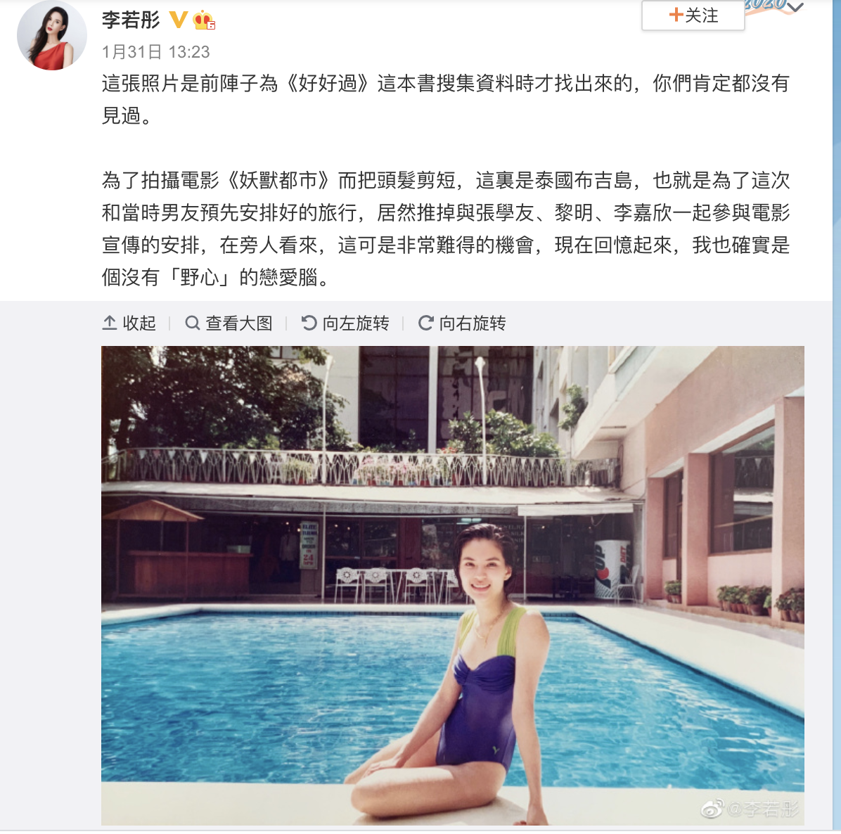 李若彤留言:「早前為出書《好好過》搜集資料時找出來的照片,並肯定大家都沒見過,為了拍攝電影《妖獸都市》而把頭髮剪短,這裏是泰國布吉島,也就是為了這次和當時男友預先安排好的旅行,居然推掉與張學友、黎明、李嘉欣一起參與電影宣傳的安排,在旁人看來,這可是非常難得的機會,現在回憶起來,我也確實是個沒有『野心』的戀愛腦。」