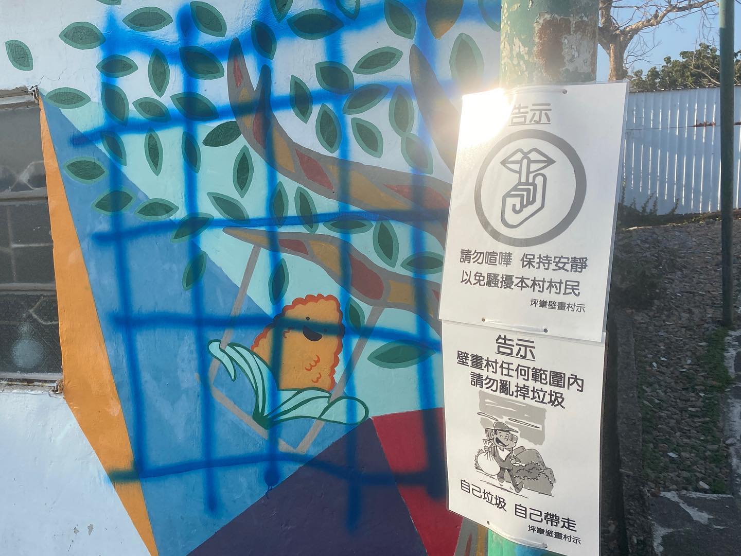 不過,90後藝術家梁洛熙(Giraffe)日前在Facebook表示,受疫情影響,坪輋居民因為遊客騷擾,被逼自毁壁畫。他親自到訪村內走一趟,發現第一幅壁畫被噴上藍色格仔,亦看到大量告示「請勿喧嘩,以免騷擾本村村民」、「請戴好口罩才能入村」、「壁畫村任何範圍內請勿亂掉垃圾」等。