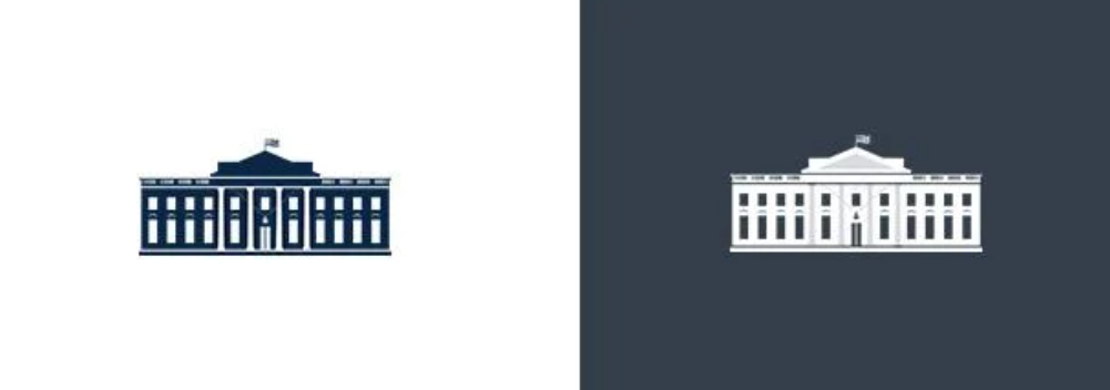 特朗普時期的白宮標誌,左邊為基本設計,右邊為套用至深色背景時,主體依然為白色
