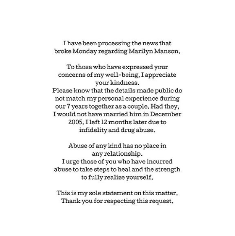 不過Marilyn Manson前妻Dita Von Teese就發聲明力撐前夫,Dita Von Teese表示:「那些公開了的細節,與我跟他7年一起時的經歷不相符。如果有這些事,我也不會在2005年12月與他結婚。12個月後,因為不忠與濫藥,所以我才離開了。」