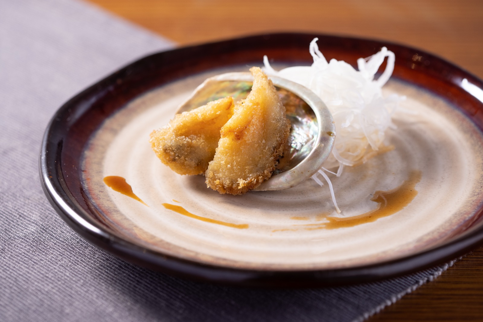 以下推介幾款餐廳必試小食,先有「磯煮鮑魚」。以日式醬油醃製的新鮮鮑魚,再慢煮4小時令其軟身。上菜前再進行油炸,令鮑魚的外層更鬆脆,同時保持到肉質鮮嫩。