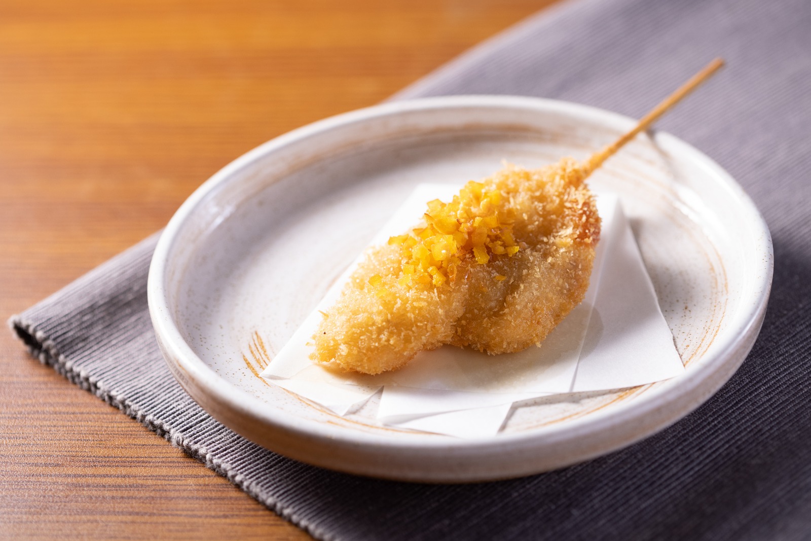 「鹽麴雞」選用以米和麴菌發酵而成的米麴,醃製鮮雞塊,再製成串揚。米麴的鈉含量比食鹽低,對身體負擔較少,是近年熱門的健康食法。