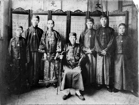 老年尢列與家人合照,約攝於1935年前後。從左至右為幼孫尤嘉伊、次孫尤嘉從、兒媳陳麗荷、中坐者為尢列、嗣子尤永昌、長孫尤嘉炎、三孫尤嘉博。(尤迪桓、尢曾家麗家藏照片)