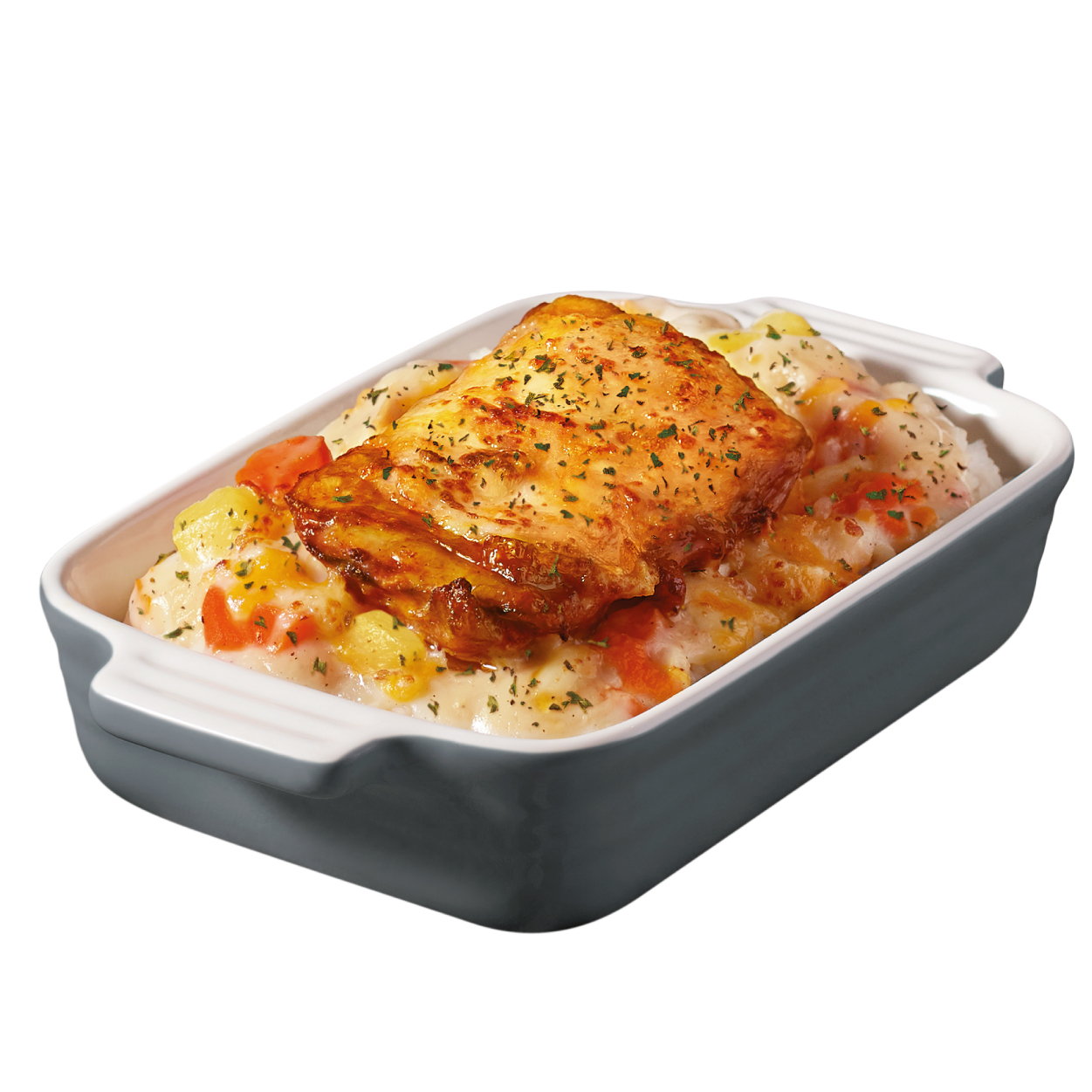 「燒雞扒雞皇芝士焗飯」特別加入經典的雞皇醬汁及濃郁芝士,配搭燒雞扒與香草一同烤焗。芝士和濃厚的雞皇汁互相融合,咬下燒至金黃的燒雞扒外層,內裡盡是多汁嫩滑的雞肉。結合經典和創新的味道,獨一無二的「芝」味令人齒頰留香。