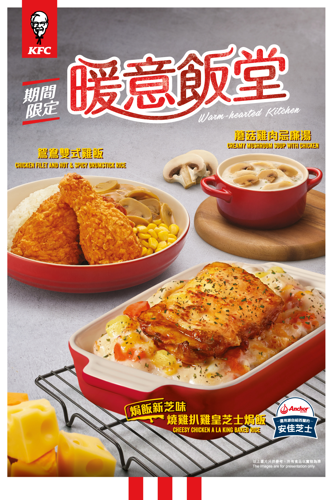 【橙訊】KFC早前曾推出「燒雞扒肉醬芝士焗飯」,反應不俗,最近再接再厲加推三款新品。即日起推出期間限定的「燒雞扒雞皇芝士焗飯」、必試的「鴛鴦雙式雞飯」以及足料的「蘑菇雞肉忌廉湯」。讓你享受多重暖笠笠滋味,帶來無窮滋味。