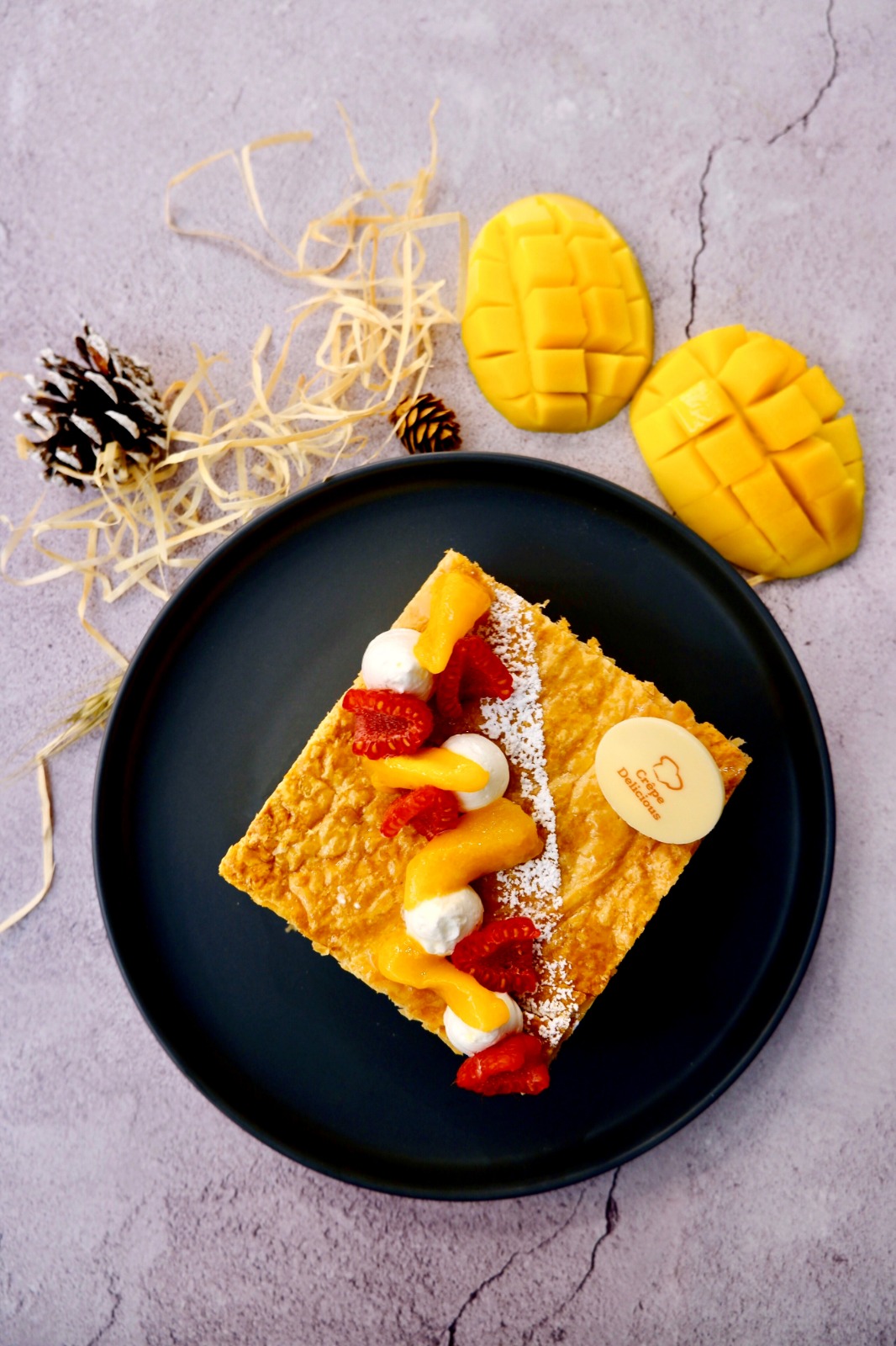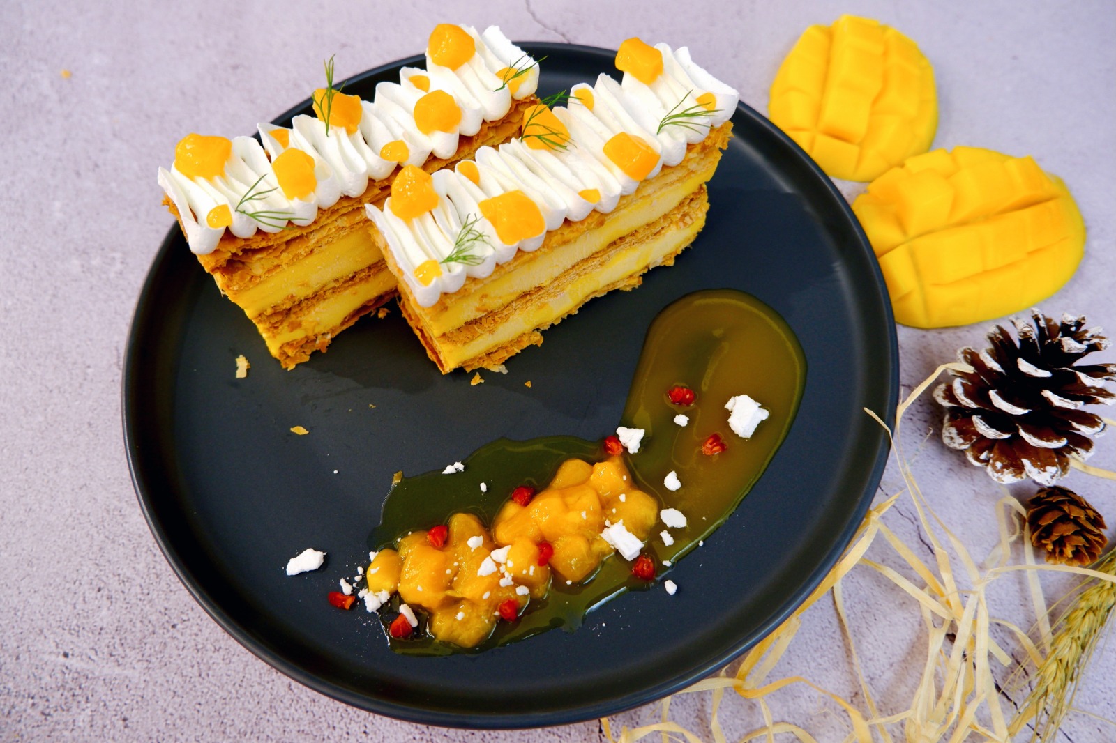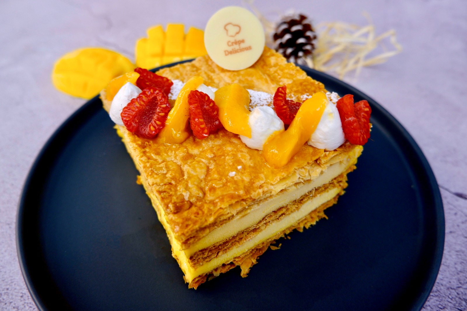 拿破崙面層鋪滿來自菲律賓的鮮芒果果肉、紅桑子、忌廉及糖霜,果味香濃。蛋糕適合兩至三人享用。此款甜品只限堂食,有興趣的朋友記得需三天前預訂。