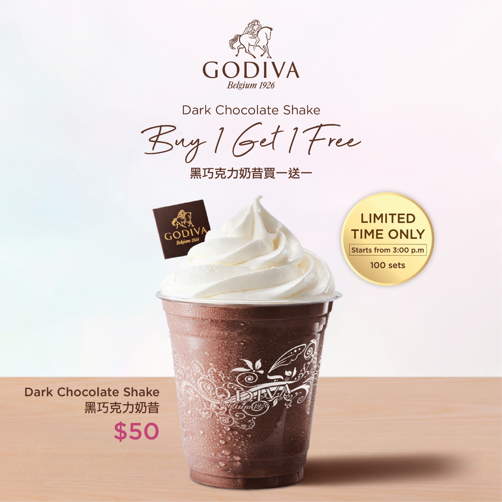 GODIVA以往曾推出「巧克力軟雪糕買一送一」及其他朱古力禮盒優惠等,今年首度推出「黑巧克力奶昔買一送一」的限時優惠,實屬夏日透心涼之選。「黑巧克力奶昔買一送一」的連續四天快閃優惠期為3月18日至3月21日,每天下午三時起推出此優惠。每店限售100套,售完即止。