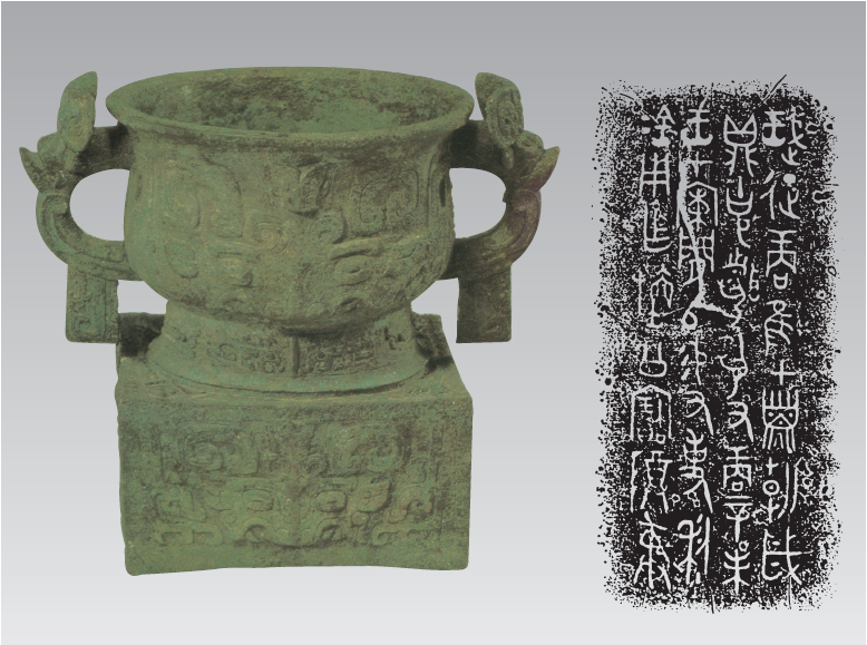 利簋及銘文拓片:利簋是西周早期青銅器,器內底鑄銘文4行33字,記載了武王伐紂這一重大歷史事件。銘文內容與中國古代文獻記載完全一致。作器者名「利」,他隨武王參戰,勝利後受到獎賞,鑄造這件銅器以記功並用來祭奠祖先。