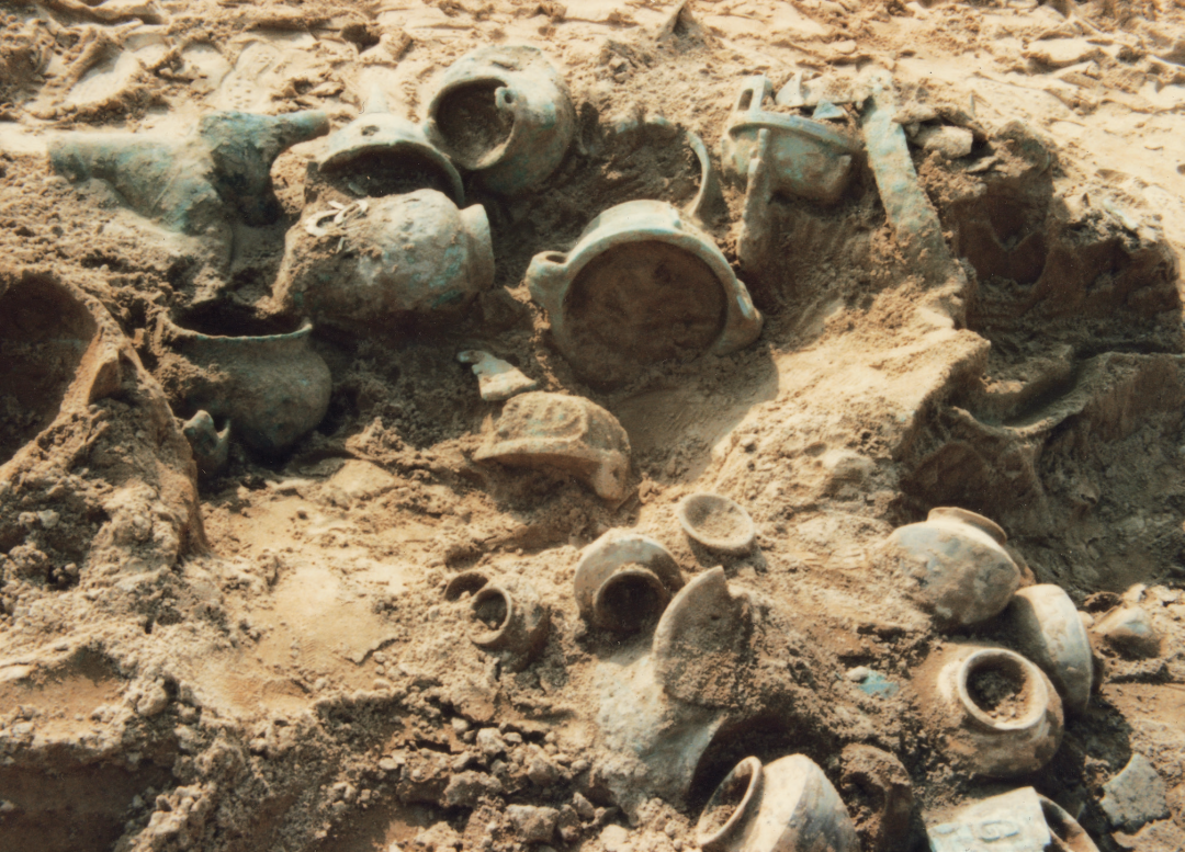 江西新干商城青銅禮器出土現場:在這座商代大墓中,總計出土青銅器475件,是長江以南地區最大的商代考古發現。當地青銅業之發達,亦可見一斑。