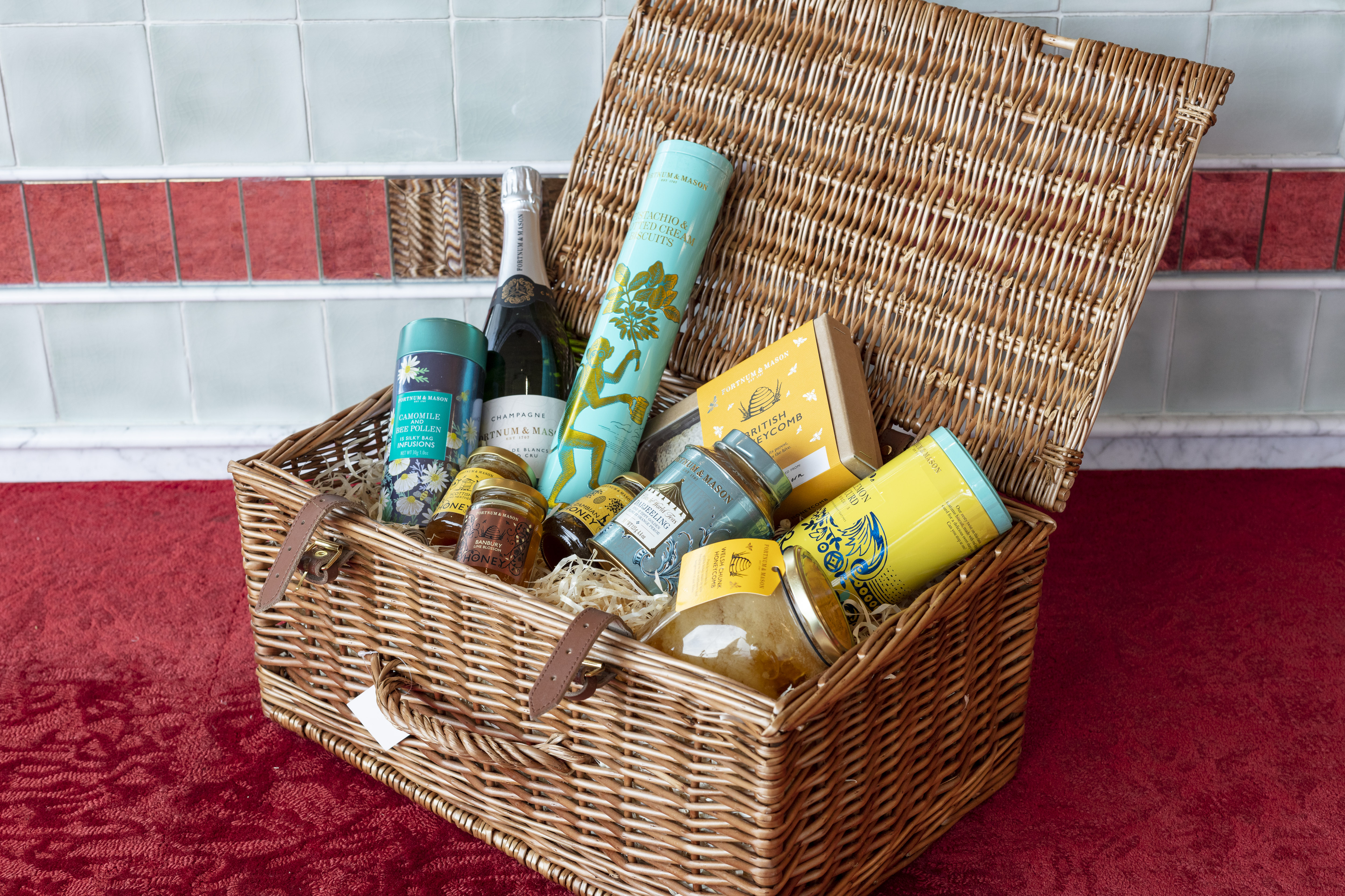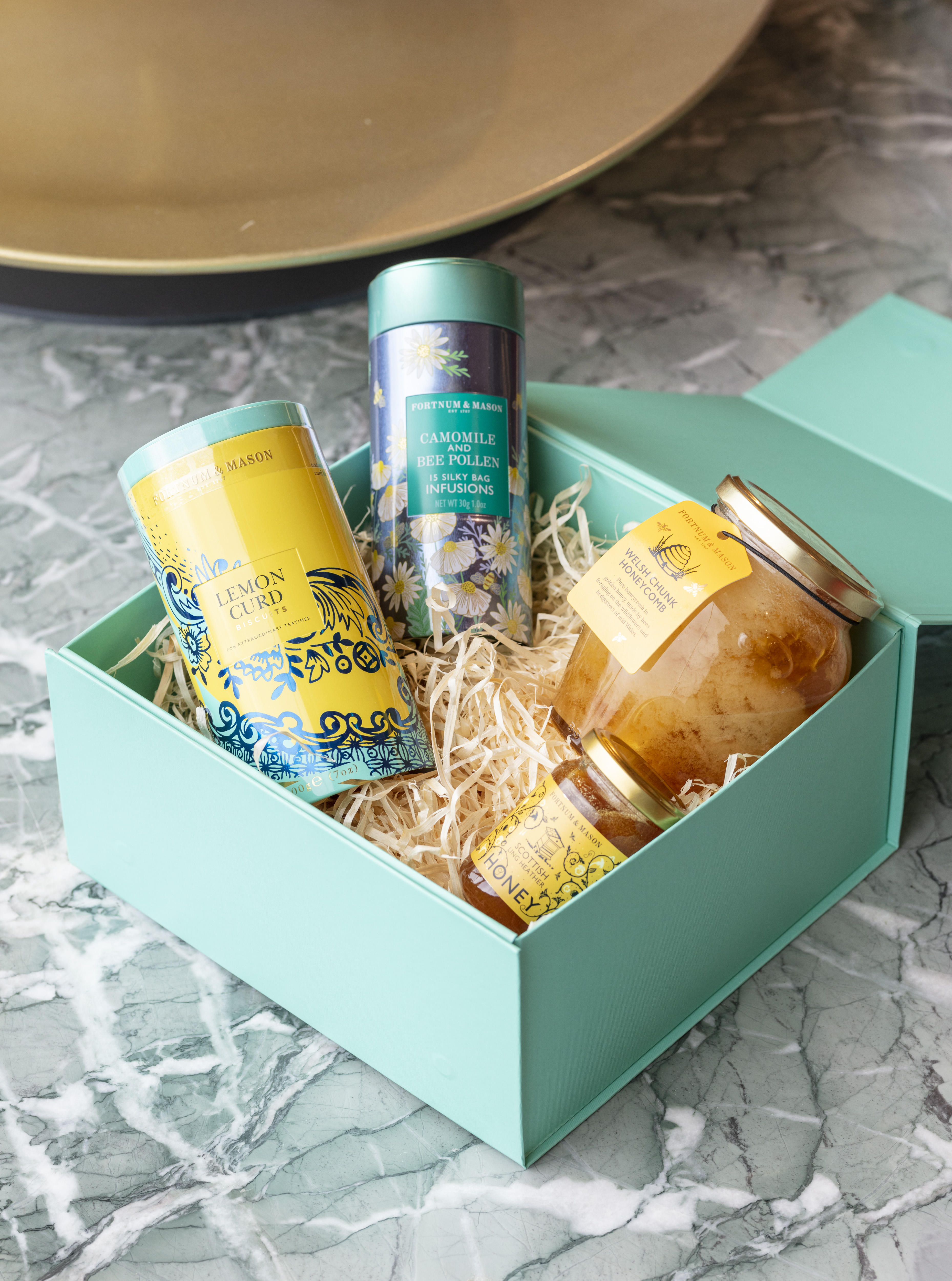 「蜂蜜盛宴禮物籃」($3,388) 能品嚐來自全球的美味蜂蜜,如蘇格蘭石楠花蜂蜜、班伯里青檸花蜂蜜和贊比亞森林蜂蜜,另附有雙層鍍銀蜂蜜棒。禮物籃内有威爾士原塊蜂蜜、開心果和凝塊奶油及皮卡迪利檸檬凝乳餅乾等甜品。再細細品嚐一杯洋甘菊花粉茶或大吉嶺散葉茶,更能放鬆心情。