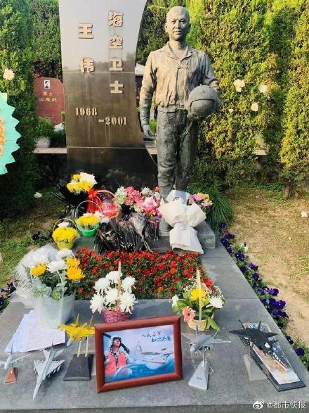 有民眾自發到王偉墓前獻花,還送上中國戰機和航母模型。