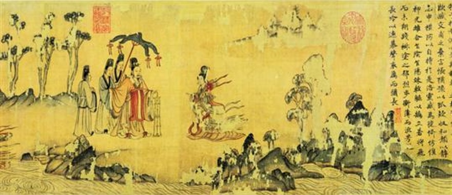 曹植與甄皇后之間是否存在愛情故事,歷來眾說紛紜。晉代顧愷之依據曹植〈洛神賦〉而作圖,是史上第一幅以文學作品為基礎的繪畫作品。此本為宋人臨摹之顧愷之《洛神賦圖》,現藏遼寧省博物館。