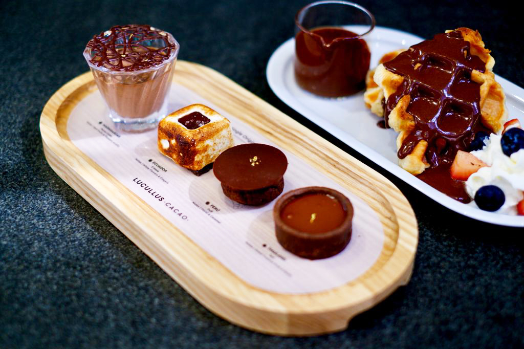 LUCULLUS CACAO嚴選馬達加斯加、泰國、秘魯及厄瓜多爾四大產區的可可設計出不同法式甜點及飲品。多款輕食及飲品每日新鮮焗製或即席製作,每款滿載獨特可可風味,充分體現龍島朱古力甜品的創意之處。
