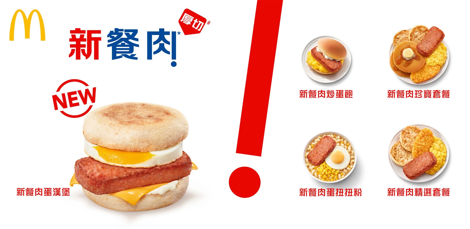 NEW LUNCHEON MEAT新餐肉系列選用麥當勞獨家供應的厚切新餐肉,強勢加盟的「新餐肉蛋漢堡」以厚切新餐肉搭配香滑蒸蛋,加上芝士及鬆餅,早餐美味又吸引。