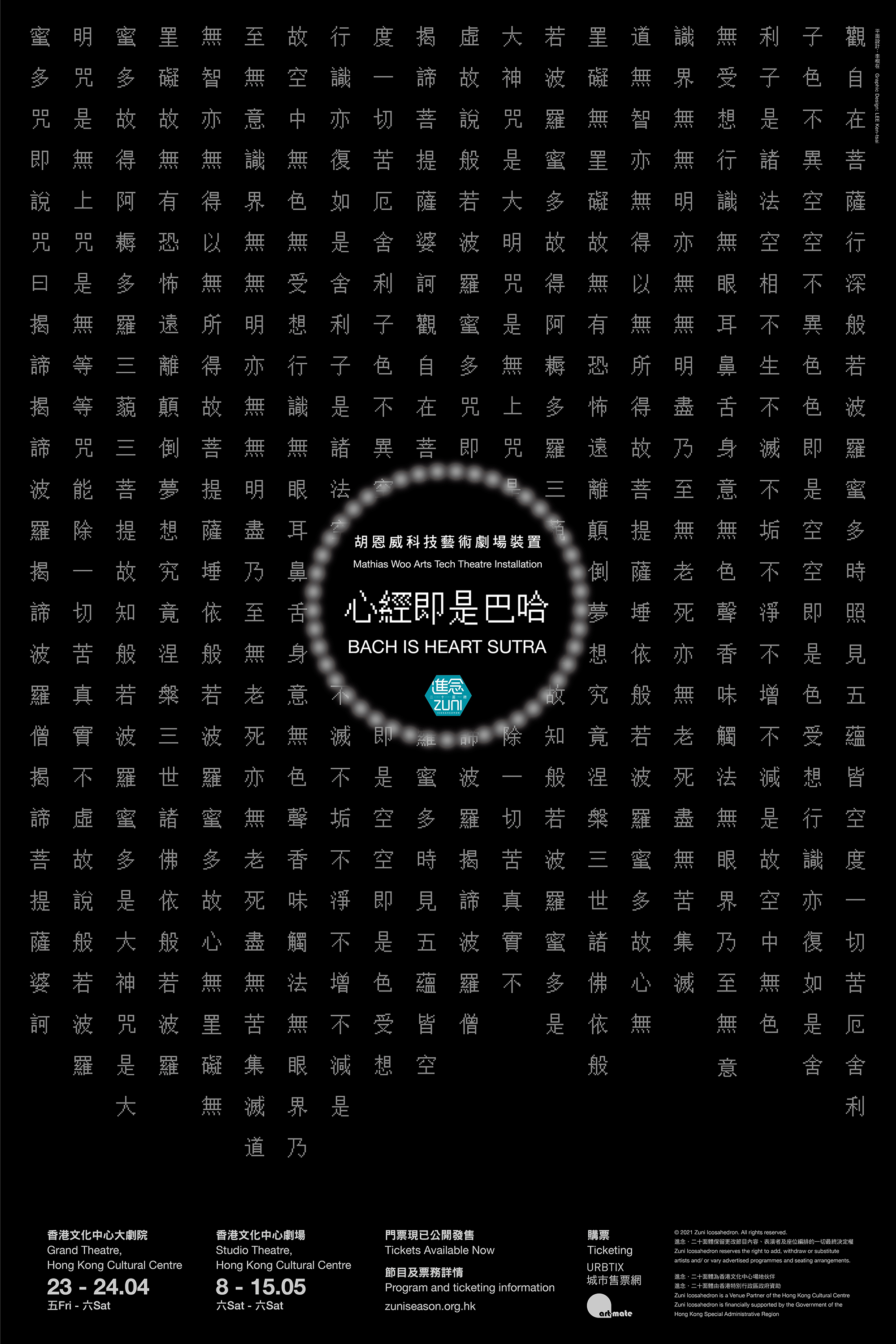 胡恩威科技藝術劇場裝置《心經即是巴哈》分為三部分:聲影劇場演出、禪行裝置體驗、網上節目。