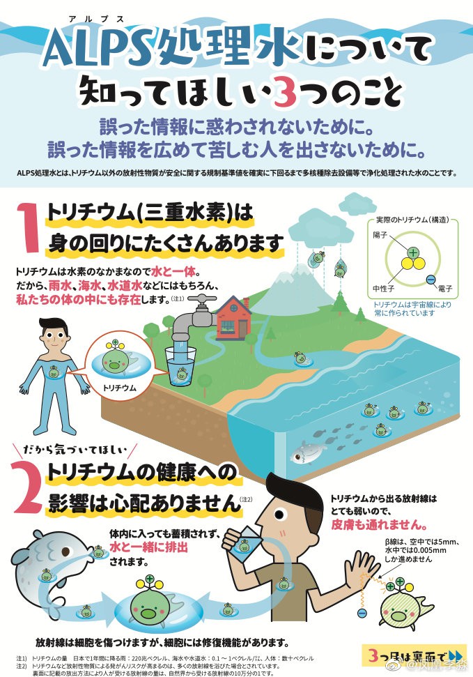 此前報道,為了宣傳東京電力福島第一核電站處理水中所含有的放射性氚的安全性,日本復興廳於13日製作並發布了宣傳冊和影片,「放射性氚」被擬化成了「吉祥物」的可愛角色,宣傳放射性氚也存在於雨水、海水、自來水和人類的身體中。