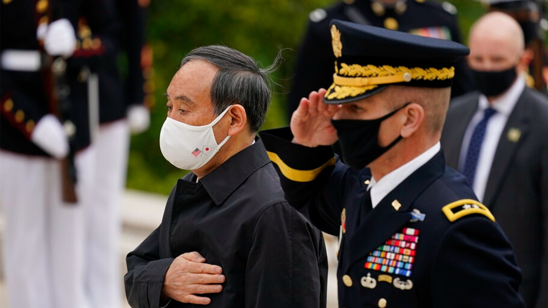 菅義偉訪美期間與美國陸軍少將瓊斯到訪位於弗吉尼亞州的阿靈頓國家公墓,參加敬獻花圈儀式。菅義偉當時佩戴的白色口罩上印有美國國旗和日本國旗。