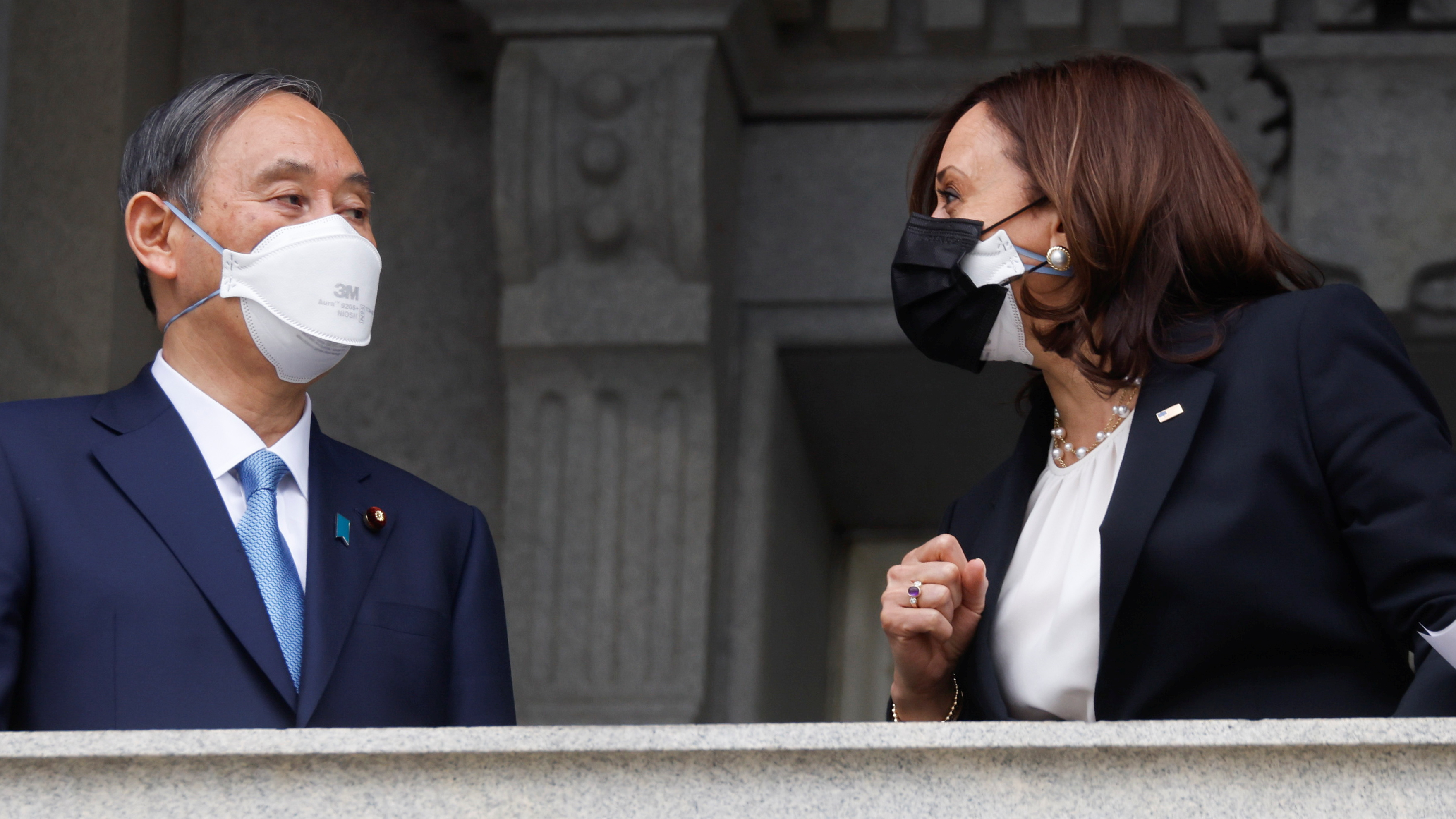 另據美聯社報道,在美日雙邊會談召開前,美國副總統賀錦麗接見了菅義偉。圖片顯示,當時,賀錦麗同樣佩戴了黑白雙層口罩,但菅義偉當時只戴了一個白色3M口罩。