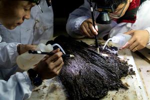 考古人員小心整理從海昏候墓出土的竹簡。圖:澎湃新聞