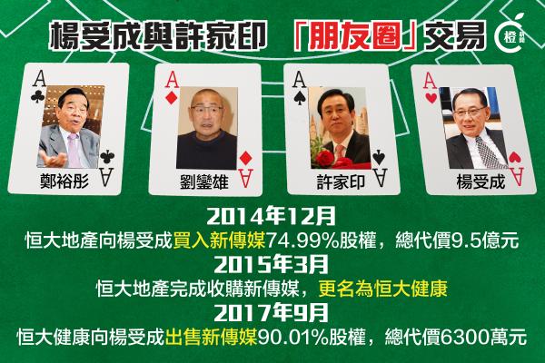 【橙訊】香港富豪圈子里有以已故的「彤叔」新世界(00017)創辦人鄭裕彤為首的「鋤Dee會」,其成員恒大(03333)主席許家印3年前以9.5億買下另一成員楊受成的新傳媒集團,令恒大健康(00708)借殼上市。恒大健康昨晚公佈,已將新傳媒集團90%持股悉數售予楊受成名下公司,總代價6300萬元,出售虧損達1200萬元。