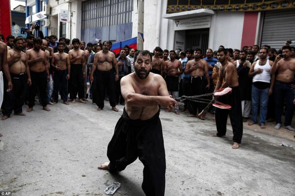 什葉派穆斯林1日齊聚伊拉克慶祝,男信徒各個脫掉上衣,只穿著下褲舉行儀式,每人手裡拿著鞭子、長刀等尖銳武器,狠甩、用力砍自己的頭部、背部;甚至有家長一手抱著自己的孩子,一手拿著利刀狠割兒子頭部,不論對方怎麼哭喊也不理會,就是要讓血噴滿地。