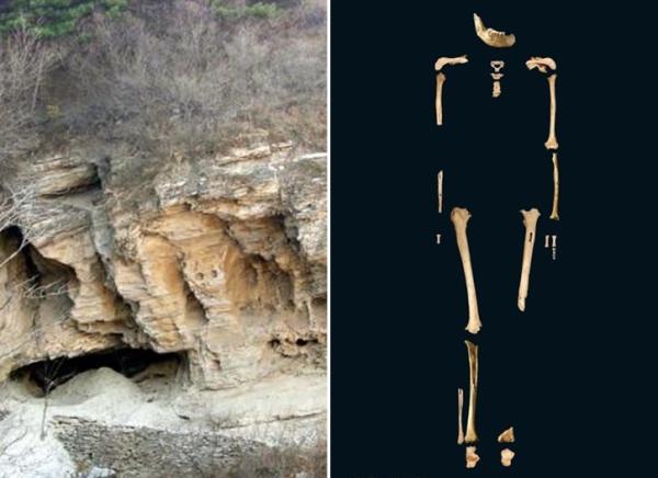 北京田園洞遺址外觀(左)及田園洞人骨架。圖:fb