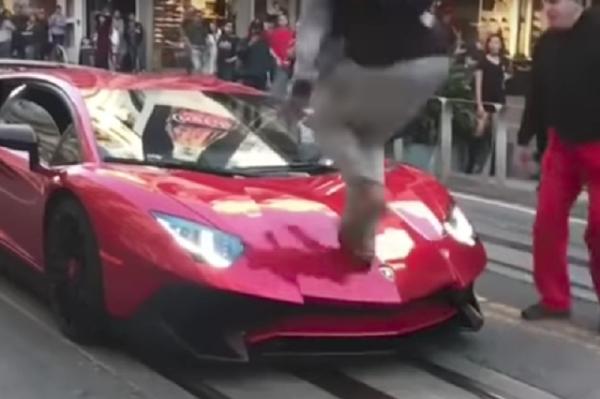 這輛林寶堅尼的價值約值42萬美金(約330萬港元)的「Aventador Superveloce」,影片中身穿黑衣紅褲的車主,他將車子停在街頭後站在一旁,這時卻突然衝出男子踩上林寶堅尼的引擎蓋,接著更踏上擋風玻璃及車頂。見到愛車被這樣對待,車主雖然立刻追上去,但卻追不到。