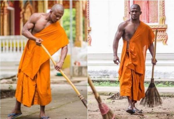 照片中,飽滿的肌肉線條讓人忍不住多看一眼,引起網友熱烈討論,驚呼:「沒看過這麼壯的和尚!」不少眼尖的格鬥迷一眼就認了出來,該名掃地僧真實身分是泰國拳王播求(Buakaw Banchamek),曾兩奪K-1 World MAX世界冠軍,被日本媒體譽為「史上最強之男」。