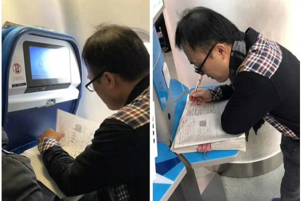 【橙訊】內地學生為了將來有好出路,改善生活日夜啃書做功課,老師也不輕鬆,最近佛山一所初中的老師忙至分身不暇在飛機上改210份卷的照片在內地網路爆紅。照片中一名老師從候機室站著,一路到坐在飛機上全程都全神貫注在批改試卷。