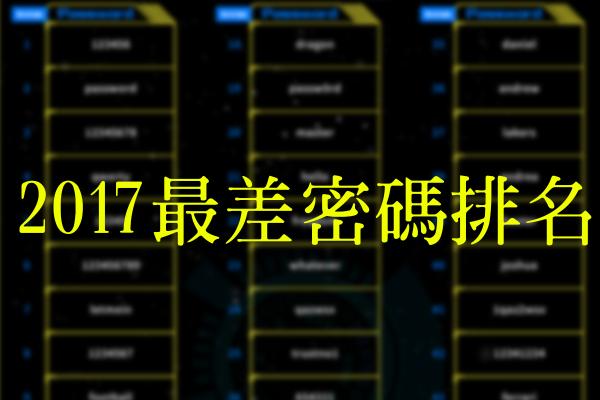 網絡保安公司SplashData公佈2017最差勁密碼排名。在被黑客破解的500多萬組密碼中,不出所料最差的密碼是「123456」,第二位則是「passowrd」。大家快來看看自己用的密碼到底有多廢!