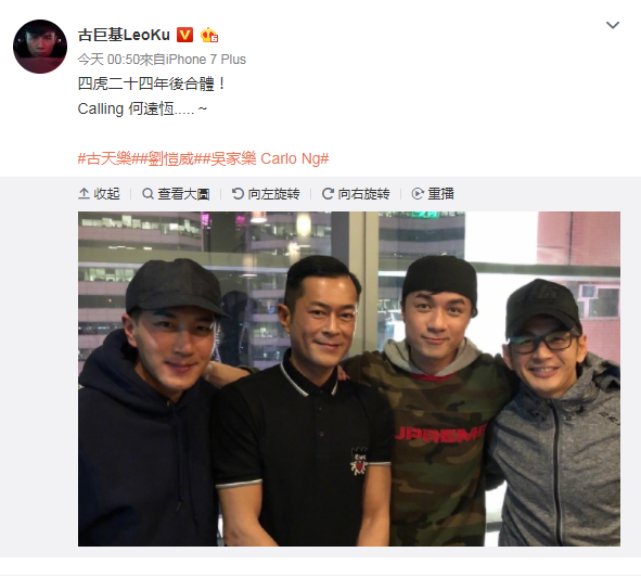 隔了不久,古巨基亦在微博上傳合照,並寫到「四虎二十四年後合體!