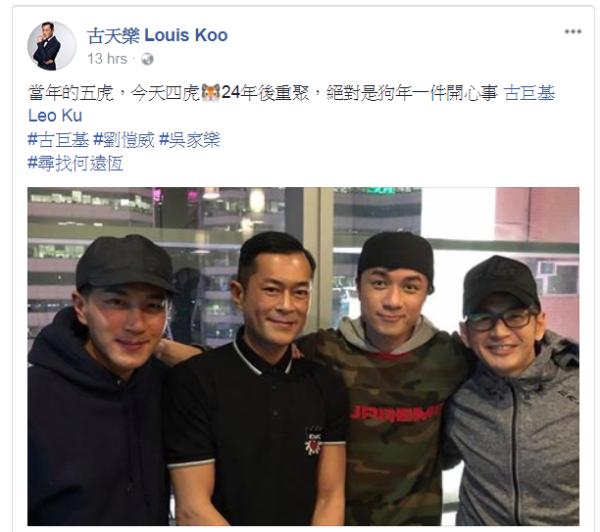所講就係噚晚,古天樂就喺Facebook專頁發佈咗一張照片,相中有他、劉愷威、古巨基、吳家樂,內文寫到「當年的五虎,今天四虎 24年後重聚,絕對是狗年一件開心事古巨基Leo Ku #古巨基#劉愷威#吳家樂#尋找何遠恆」