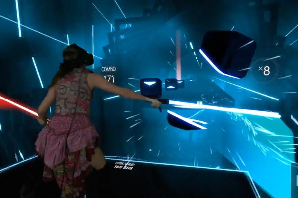 這遊戲叫《Beat Saber》,玩法就是左右手分別拿著藍、紅光劍,跟隨顏色和箭嘴方向劈開方塊,當然還有音樂節拍要捉緊。這種無雙式的雙手狂劈,相信3歲到80歲的男生都一定會愛上!