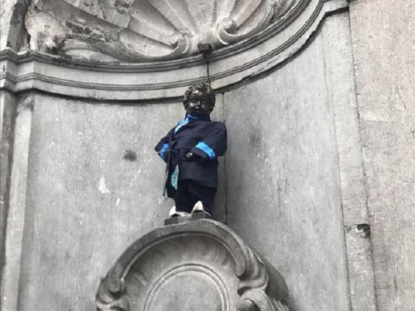 雕像成為比利時的「外交官」,不時換裝。圖:中央社