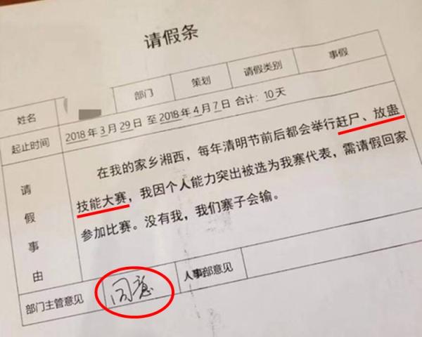 有網民分享一張「請假紙」,紙上的請假理由竟寫著「在我家鄉湘西,每年清明節前後都會舉行趕屍、放蠱技能大賽,我因個人能力突出,被選為我寨代表,需請假回家參加比賽。沒有我,我們寨子會輸」,雖然理由非常奇特,但其上司亦欣然簽署了同意。