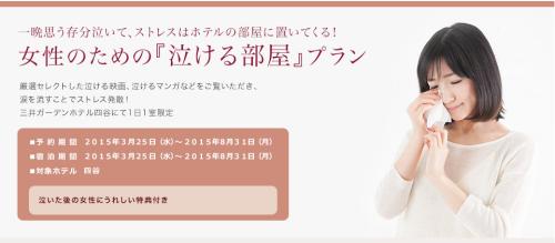 近日,日本社會流行「哭泣有助紓壓」的「淚活」話題,於是位於東京新宿區的「三井花園酒店四谷(三井ガーデンホテル四谷)」看準日本女性在社會壓力大,要紓壓的商機,推出女性專屬「哭泣房」服務,讓認真生活的女性,有紓壓的空間,房間限1人入住,每次收費1萬日圓(約650港元)。從即日起至8月31日止,酒店每天提供1間「哭泣房」服務。