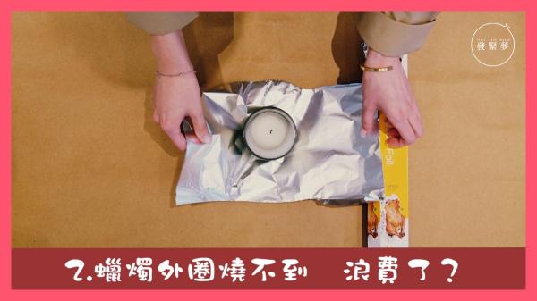 Tips:用錫紙包裹蠟燭的原理是令到整個蠟燭的受熱均勻,所以即使是未出現「記憶圈」,亦可以在燃點時將蠟燭包裹,預防「記憶圈」的出現。